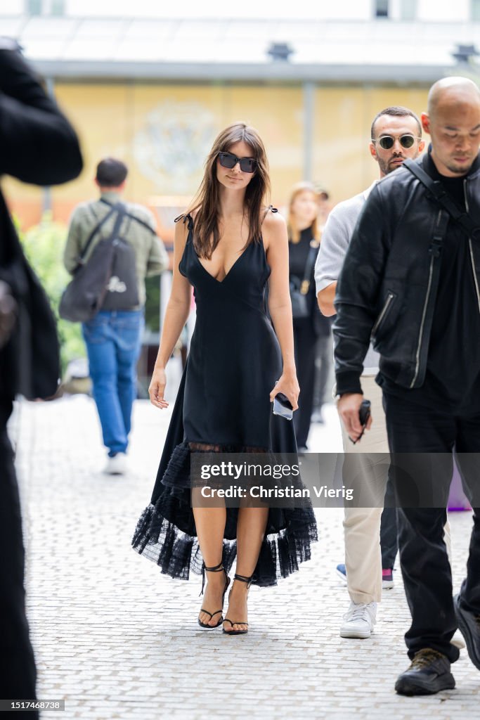 Emily Ratajkowski is seen wearing sunglasses, black dress outside