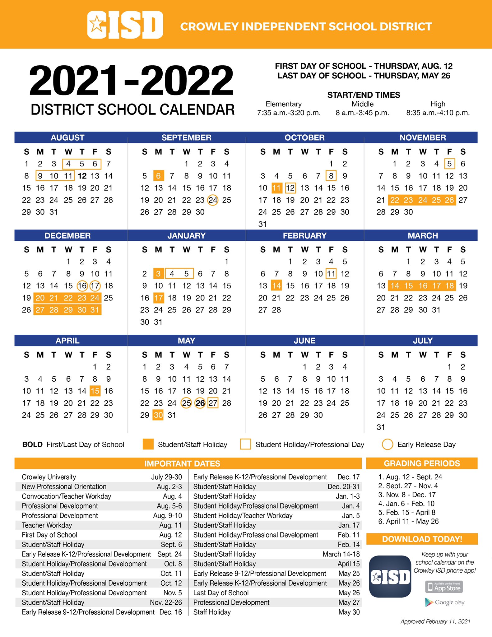 Crowley Isd Calendar 2020 21 Crowley ISD The Crowley ISD Board of Trustees has approved the : Get the inside scoop on how colleges assess your high school and its course rigor. Featuring a former Admissions Officer, you’ll gain crucial insights and actionable strategies during this 60-min . Rs 1.23 lakh crore (US$ 17.40 billion) for Rural development & Panchayati Raj. Agriculture credit: Rs 15 lakh crore (US$ 212.31 billion) target set for the year 2020-21. PM-KISAN beneficiaries to be .